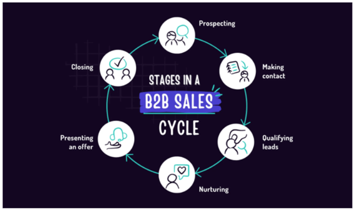 A sales cycle refers to the predictable phases required to sell a product or service, and it can vary among organizations, products, and services. Each sale is unique, but the sales cycle generally encompasses activities such as generating and maintaining interest through marketing efforts and engaging and converting leads into customers. Visualize the sales cycle using the following simplified representation: